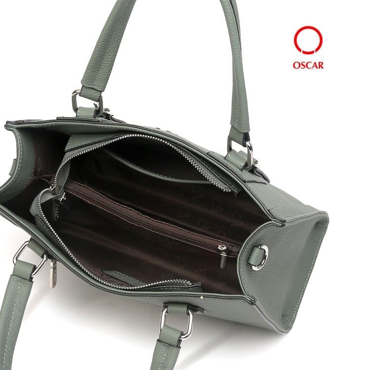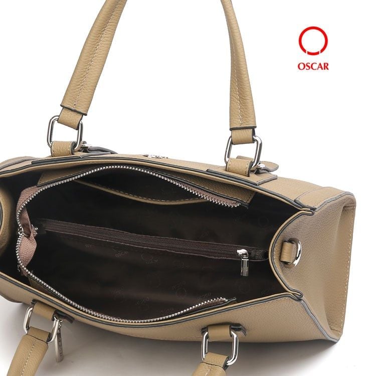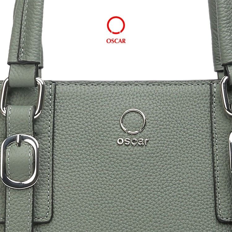 Logo Oscar kim loại gắn nổi bật ở mặt trước túi, vừa sang trọng vừa tăng nhận diện thương hiệu.